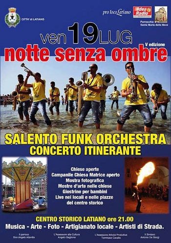 Centro Storico di Latiano, la quinta edizione della "NOTTE SENZA OMBRE", organizzata dall' Assessorato alle Attività Produttive in collaborazione con la Pro Loco Latiano, Idea Radio e la Parrocchia S. Maria della Neve con il sostegno di numerosi artigiani e commercianti.Il programma della serata prevede: