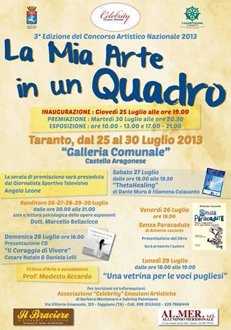 indetto la 3° Edizione del Concorso Artistico Nazionale 2013 “La mia arte in un quadro”. Il concorso inizierà con l’inaugurazione della mostra pittorica giovedì 25 Luglio alle ore 19,30 per concludersi con la premiazione che si terrà martedì 30 Luglio 2013. Orari di visita al pubblico: dalle 10 alle 13, e dalle 17 alle 21.