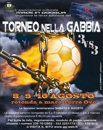 dell’estate 2013 sulla costa jonico-salentinaAnche quest’anno l’associazione culturale “Made in Pooglia” ripropone la terza edizione del Torneo nella Gabbia. Un torneo di calcio a 3 che si disputerà l’8 - 9 - 10 agosto sulla rotonda a mare di Torre Ovo, litoranea Salentina.