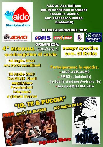 con le locali sezioni comunali ADMO e AVIS e con il patrocinio del Comune di Erchie, organizza anche quest’anno, il Memorial Davide Ciccarese, quadrangolare di calcio, giunto ormai alla quarta edizione. Due serate, quelle di venerdì 26 e martedi 30 luglio all’insegna dello sport e dell’impegno civile. Il torneo di calcio, infatti, non sarà solo un’occasione di divertimento, di competizione e gioco di squadra, ma sarà sopratutto un’occasione per ricordare il giovane Davide Ciccarese, scomparso prematuramente nel 2010, i cui organi, con un gesto di estrema generosità, vennero donati dalla famiglia, a chi era in attesa di trapianto, aiutando, perciò, e dando una speranza di vita a tante altre persone sofferenti.