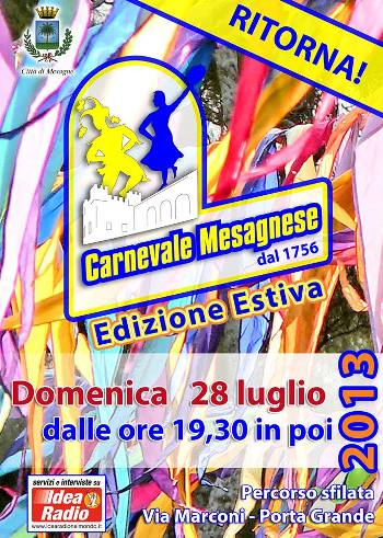 Una riproposizione della sfilata con i carri allegorici costruiti dai cartapestai mesagnesi che ruotano intorno alle maschere locali di Grappolino e Pizzica-pizzica partirà per le ore 19 dal piazzale del mercato settimanale di Via Brodolini e raggiungerà la Porta Grande per le ore 22 circa; qui si fermeranno e vari dj trasformeranno la piazza in una pista da ballo estivo.