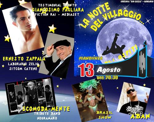 religiosa di San Giovanni Bosco di Manduria l'oratorio si trasforma per una sera, quella del 13 agosto per la precisione, nel contenitore ideale di numerosi spettacoli e intrattenimenti per dar vita alla prima notte bianca dell'oratorio, appunto LA NOTTE DEL VILLAGGIO, all'insegna del divertimento con una vasta scelta di spettacoli e attrazioni per tutta la famiglia.