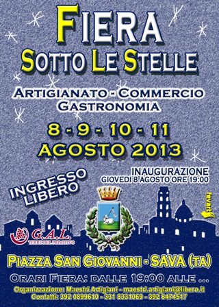 dell’estate, Sava ospita anche la “Fiera delle eccellenze artigianali”, che sarà inaugurata oggi (giovedì) e che sarà visitabile sino all’11 agosto. Sarà allestita in piazza San Giovanni, a cura della Fevart, e sarà dedicata all’artigianato, al commercio e alla gastronomia.