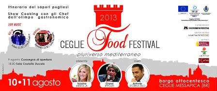 L’edizione 2013 del Ceglie Food Festival, con il tesoriere enogastronomico pugliese e con grandi chef italiani, stellati e pluripremiati (alcuni operanti in Puglia, altri – di origine pugliese – impegnati in alcuni dei grandi templi della ristorazione europea e mondiale) è incentrata sulla mediterraneità, di cui la Puglia rappresenta uno straordinario e unico emblema, e che diventa l’elemento culturale portante degli Show Cooking serali e dell’Itinerario del Gusto tra le piazze e le vie del Borgo Ottocentesco di Ceglie Messapica, lungo una passeggiata di oltre mille metri.