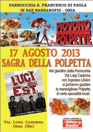 A partire dalle 20.30, l’area circostante la “Chiesa Nuova” sarà invasa dagli invitanti profumi delle polpette, preparate al momento in tutte le varietà, di Carne, Fritte o al Sugo, di Riso, di Melanzane, Ortolane o di Pane pronte per essere gustate calde e in allegria.