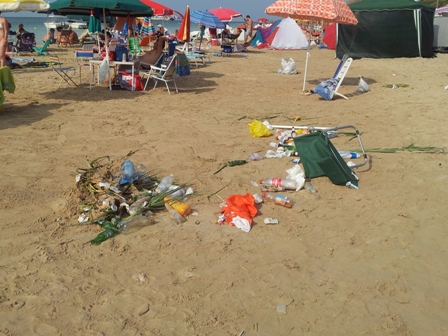 Rifiuti di tutti i tipi abbandonati in spiaggia (da avanzi alimentari a bottiglie di plastica e di vetro), e dune danneggiate e sporcate