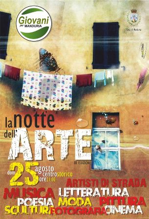 «Da ormai tre anni – ribadisce Tullio Mancino, presidente di Giovani per Manduria – il nostro Movimento regala alla città un’intera serata all’insegna dell’arte, rappresentata nelle sue più diverse forme, dagli artisti più interessanti del panorama locale e non solo. Una importante occasione per promuovere e valorizzare le tante risorse del territorio e i luoghi del centro storico, da noi sempre considerato il fulcro dello sviluppo turistico manduriano. Tutto ciò, nella consapevolezza che la cultura è il miglior motore di crescita di una comunità».