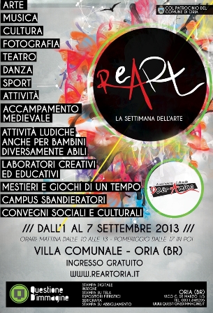 L’associazione culturale “Dear Amico” di Oria, assieme a tante associazioni e realtà amiche operanti sul territorio, presenta “Re-Art 2013 – La Settimana dell’Arte”, sette giorni dedicati all’arte, alla cultura, allo sport, al volontariato e al territorio.