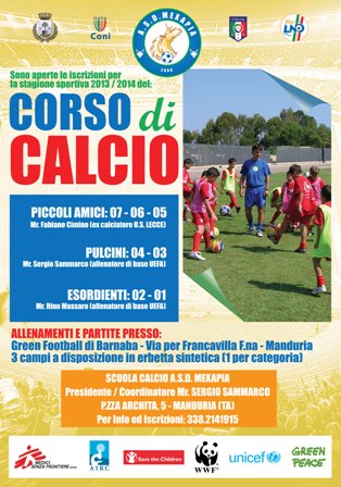 La nuova stagione sportiva 2013-14, della Mexapia di Manduria si apre con il raduno del 4 settembre 2013, alle ore 15,30, nella confortevole ed attrezzata area calcistica del Green Football di G. Barnaba, sulla via per Francavilla a Manduria. In essa, tutti i ragazzi potranno fare del sano sport in un ambiente confortevole con l’ausilio di tecnici preparati e qualificati.