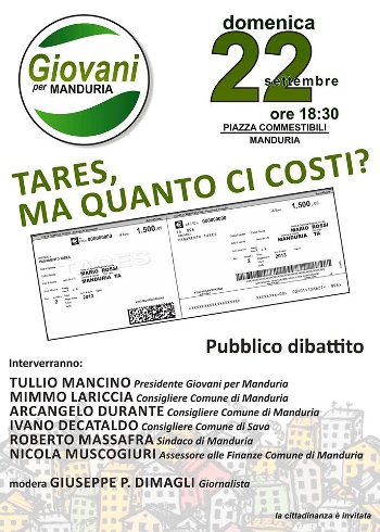 “Giovani per Manduria”, avrà luogo domenica sera, alle 18,30, in piazza Commestibili (o nel palazzo delle Serviti in caso di condizioni meteorologiche inclementi).Oltre a Tullio Mancino, presidente del movimento, prenderanno parte al dibattito Mimmo Lariccia e Arcangelo Durante (unici consiglieri firmatari della richiesta di convocazione del Consiglio Comunale monotematico sulla questione Tares), il consigliere del Comune di Sava Ivano Decataldo (che riporterà l’esperienza del suo Comune, che ha deciso di gestire il tributo direttamente), il sindaco Roberto Massafra e l’assessore alle Finanze del Comune di Manduria, Nicola Muscogiuri. Modererà il giornalista Giuseppe P. Dimagli.