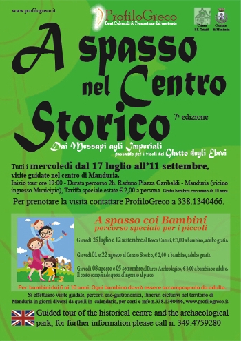 storico”, che ha avuto dopo tanto tempo di assenza l’appoggio del Comune di Manduria, si chiude con un bilancio positivo sia per il numero dei partecipanti (una media di circa 30 persone per visita guidata), sia per l’entusiasmo di famiglie e bambini per la passeggiata dedicata ai piccoli, sia per i turisti che durante il cocktail di benvenuto offerto dalla Confcommercio chiedevano dove poter comprare i prodotti appena assaggiati, sia per noi che ci siamo divertiti a far conoscere il nostro territorio».L’agenzia “Profilo Greco” traccia il bilancio di due mesi di incontri, visite, passeggiate e appuntamenti vari.
