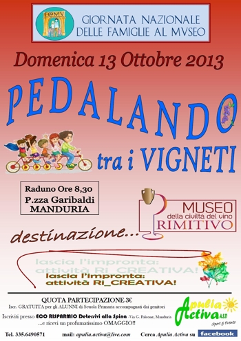in programma per il domani. Si parte con la Cicloescursione che condurrà gli amanti delle due ruote – sia quelli esperti che quelli più giovani e in erba - alla scoperta dei vigneti nella zona del Primitivo (raduno in Piazza Garibaldi ore 8,30).Si potranno osservare i diversi metodi di coltura adottati, ammirare gli intensi colori e godere dei profumi che la terra offre nel periodo autunnale, all’indomani di quella grande festa che è la vendemmia. E per celebrare tutti insieme la gioia e i riti della campagna, il creative-lab “Lascia l'impronta” coinvolgerà i più piccoli, per insegnare loro l'importanza della fantasia e dello stare insieme, giocando (e imparando) con la natura.
