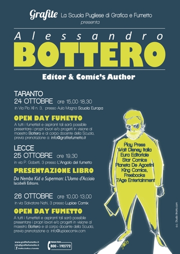 anno presso le sedi di Taranto e Lecce (la rinnovata Grafite-Lupiae Comix) della scuola di grafica e fumetto pugliese Grafite, Alessandro Bottero incontrerà il pubblico in una serie di open-day che permetteranno ad appassionati e curiosi di visitare le sedi della scuola e di fare la conoscenza dell'autore; a fumettisti e aspiranti fumettisti di presentare i propri lavori in visione al maestro Bottero e al corpo docente della Scuola.L'appuntamento è a Taranto, in Via Pio XII n. 3, presso la Scuola Europa dalle 15:00 alle 18:00 di giovedì 24 ottobre; a Lecce, in Via Salvatore Nahi n.3, dalle 10:00 alle 13:00 di sabato 26, Per entrambi gli appuntamenti è necessaria la prenotazione a mezzo mail da inviare a info@grafitefumetto.it