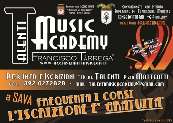 giorni la Music Academy Francisco Tàrrega con sede a Sava, darà l'atteso via all'anno accademico 2013-14. Dopo il grande successo dello Spettacolo di Presentazione andato in scena presso la sala Amphipolis lo scorso 6 ottobre, organizzato dall'Accademia Tàrrega per preannunciare l'apertura della sede di Sava, ed insieme presentare in anteprima alcune tra le tante proposte didattiche ed iniziative musicali che ha preparato per il proprio territorio, ecco finalmente giunto il tanto atteso giorno di apertura, fissato per domenica 27 ottobre alle ore 18,30.