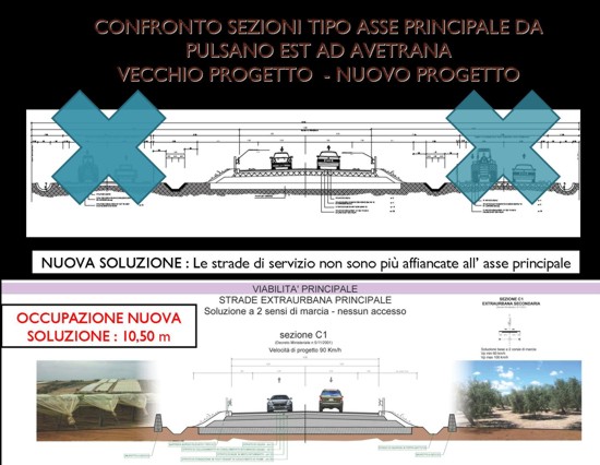 degli uffici regionali addetti alla Valutazione d’Impatto Ambientale, hanno proceduto ad una riconfigurazione del tracciato viario, che sfrutti, su tutta la propria estensione, la viabilità esistente. Inoltre si è proceduto con la riduzione dell’ingombro della sede stradale e la realizzazione di uno studio che consenta l’eliminazione delle previste “controstrade” laterali. Il nuovo progetto ha previsto anche la riduzione dell’ingombro degli svincoli a raso previsti nel progetto definitivo e il contenimento del numero delle rotatorie complessivamente previste lungo il tracciato e lungo le bretelle.Le nuove soluzioni prevedono, pertanto, che le strade di servizio non siano più affiancate all’asse principale e l’eliminazione della viabilità minore di nuova realizzazione.