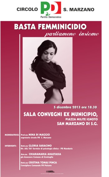 Marzano ospiterà un incontro-dibattito sul sempre più attuale tema del femminicidio. L’iniziativa è promossa dalla neo- segretaria del circolo del PD di San Marzano, Mina Dimaggio.«Obiettivo dell’incontro sarà quello di dire “Basta al femminicidio”, un fenomeno che in Italia sta assumendo proporzioni sempre più drammatiche» afferma la prof.ssa Di Maggio. «L’incontro, aperto a tutta la cittadinanza, avrà lo scopo di porre le basi, attraverso il confronto, per il ripristino di un diritto sacrosanto che è il rispetto della dignità, dell’autonomia e della libertà femminile».