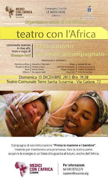 Teatro comunale di Torre Santa Susanna, - ad un anno dal precedente appuntamento- l’evento “Teatro con l’Africa”, organizzato per sensibilizzare alla campagna “Prima le mamme e i bambini” dall’associazione “Medici con l’Africa CUAMM Salento”.Con questo progetto si vuole continuare a garantire un parto sicuro alle mamme dell’Angola, Etiopia, Uganda e Tanzania, dove i tassi di mortalità materna sono tra i più alti del mondo.