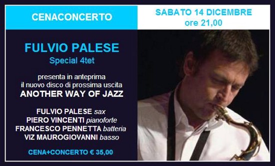 Sabato 14 Ddcembre, ore 21 circa, presso il ristorante caffè “All’ombra del Barocco” di Lecce, il “Fulvio Palese Special 4et” presenterà in anteprima una nuova “fatica” discografica: “Another way of jazz”.