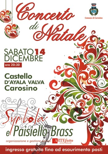 di rappresentazioni musicali in provincia.Il Comune di Carosino, in collaborazione con la Artefatto Servizi Culturali, a tal proposito, dà il 'la' al periodo delle festività con uno speciale concerto che avrà luogo nella suggestiva e caratteristica cornice rinascimentale del Castello d'Ayala Valva di Carosino, già teatro di numerosi eventi estivi di successo approntati dalla medesima società di Cosetta Giordano.