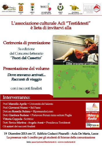 l’edificio Codacci Pisanelli , aula De Maria, la cerimonia di premiazione della terza edizione del concorso letterario nazionale “Fuori dal Cassetto” organizzato dall’Associazione culturale Acli “Testi&testi”.Il concorso, che ha visto confrontarsi autori provenienti da tutta Italia sul tema del viaggio, giunge a conclusione dopo un anno di lavoro e dopo una lunga selezione da parte della giuria composta dal prof. Marcello Aprile, docente di Linguistica Italiana all’Università del Salento, dalla dott.ssa Rossella Bufano, direttrice editoriale di Ripensandoci.com e dal prof. Giovanni Nuzzo, direttore responsabile del settimanale Bel Paese, con il coordinamento del dott. Enrico Martina e di Angelo Annè, presidente e vicepresidente dell’associazione.