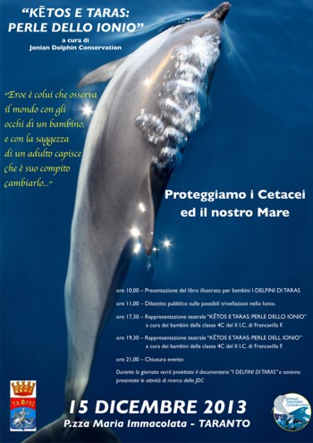 Alle ore 17.30 e alle ore 19.30 ci saranno due rappresentazioni della pièce teatrale “Kētos e Taras Perle dello Jonio” a cura dei bambini della classe 4C del Secondo Istituto Comprensivo di Francavilla Fontana che nello scorso mese di ottobre hanno partecipato a bordo di Taras, il catamarano da ricerca della JDC, a una uscita in mare con l’incontro con un branco di delfini. I piccoli attori indosseranno sagome e maschere rappresentanti delfini e altri “abitanti del mare” per lanciare il loro messaggio: sessant’anni fa avete sbagliato con l’ILVA rovinando il nostro ambiente, ora non sbagliate e tutelate i delfini dalle trivellazioni perché anche i nostri figli dovranno vederli!