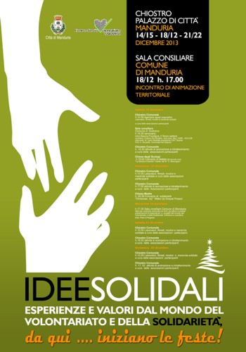 SOLIDALI” del volontariato e della solidarietà per cominciare in modo diverso le feste: a Manduria si può!Il Centro Servizi Volontariato Taranto organizza, insieme alle associazioni di volontariato di Manduria e del versante orientale della provincia, e con il patrocinio del Comune di Manduria, l’evento natalizio “IDEE SOLIDALI: esperienze e valori dal mondo del volontariato e della solidarietà…” che si svolgerà nei due prossimi weekend: sabato 14 e domenica 15 dicembre, e sabato 21 e domenica 22 dicembre.