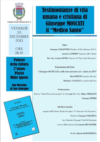 organizzato la presentazione del libro “Giuseppe Moscati, nella vita nascosta con Cristo in DIO”, che si svolgerà giorno 20 dicembre, con inizio ore 18.45, presso il Palazzo della Cultura di San Marzano di S.G.. Nel corso dell’evento ci saranno testimonianze dirette su Giuseppe Moscati ed intermezzo di Musica Sacra dell’Ass. Musicale “Giuseppe Verdi” di Monteiasi.