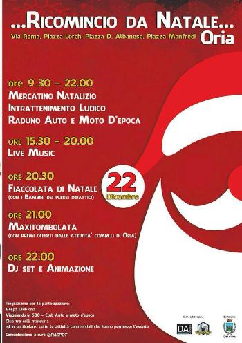 In dettaglio, l’evento - che gode del patrocinio della Città di Oria - partirà alle 9:30 con l’apertura del mercatino natalizio in via Roma e piazza Domenico Albanese.
