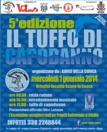 L’associazione culturale-ricreativa “Amici della Conca” del presidente Gino Crastolla in collaborazione con il Comando Provinciale dei VV.F. di Brindisi, “Summer Time – Animazione & Spettacolo”, Vivi Tutto.it e Radio Ciccio Riccio, presentano la 5.a edizione del “Tuffo di Capodanno”, un evento senza scopo di lucro e da sempre legato alla solidarietà, presentato dal noto giornalista brindisino Nico Lorusso e patrocinato dal Comune e dalla Camera di Commercio di Brindisi, in favore dei progetti del “Reparto di RadioTerapia dell’ospedale ‘Perrino’ di Brindisi”, in programma mercoledì 1 Gennaio 2014, con raduno alle 9:30, presso “La Conca” sulla Litoranea Nord di Brindisi - Zona Sciaia.