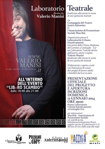“laboratori teatrali”; ognuno di questi con obiettivi e metodi di lavoro svariati e bizzarri. Il laboratorio teatrale diretto da Valerio Manisi, che sta per partire presso il “Laboratorio Urbano Emotivamente” a Grottaglie, organizzato dalla Compagnia del Teatro Jonico Salentino e dall’associazione di promozione Sociale “Macchià”, vuole semplicemente formare due gruppi di lavoro che possano, alla fine del percorso, portare in scena un’opera teatrale. Durante la preparazione e la realizzazione del testo, che agli allievi sarà consegnato all’inizio del percorso, si coglierà l’occasione per scoprire e approfondire le diverse tecniche di recitazione, movimento scenico, dizione, respirazione ecc.