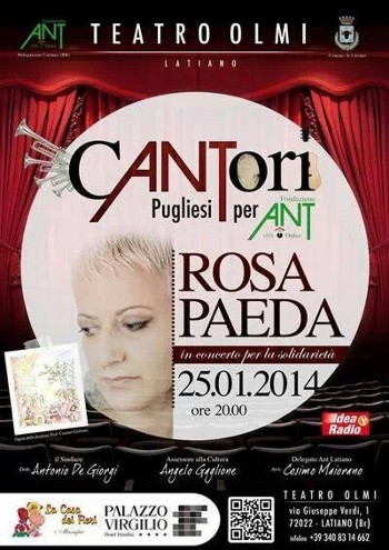 Latiano in collaborazione con l’Amministrazione Comunale di Latiano, al fine di sensibilizzare sul tema della prevenzione e della lotta contro i tumori e per raccogliere fondi da destinare all’assistenza domiciliare per i malati in fase terminale, promuove la realizzazione di un CD musicale con la partecipazione di cinque artisti affermati, che hanno accettato di mettere la faccia, e soprattutto la voce, per una battaglia che riguarda il futuro di tutti. Si tratta degli artisti Rasa Paeda, Claudio Prima con la BandaAdriatica, Dario Pinelli, i Camillorè ed i Sud Sound System. Media Partner degli eventi Idea Radio, che dedicherà all’iniziativa servizi ed interviste.Il progetto prevede oltre alla produzione del CD “Cantori Pugliesi per ANT” anche tre grandi eventi live che si svolgeranno al Teatro Olmi di Latiano. Il primo appuntamento è fissato per il 25 gennaio 2014 con l’esibizione di Rosa Paeda, il secondo il prossimo 22 febbraio con Camillorè ed infine grande chiusura il 22 marzo con l’esibizione di Dario Pinelli.