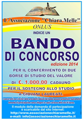 del quarto bando per l’assegnazione di due sussidi allo studio dell’importo di euro 1.000,00 cadauno riservati a giovani studenti che abbiano conseguito Laurea di 1° livello e/o di 2° livello o anche vecchio ordinamento di tutte le facoltà con una particolare prelazione a chi presenterà una tesi di laurea che abbia curato uno studio rivolto alle varie tematiche della tutela dei diritti dei minori e della famiglia.Continua l’impegno dell’associazione nella promozione e nella valorizzazione dei talenti del territorio e dell’impegno profuso in vari ambiti, in questo caso nell’ambito formativo, allo scopo di contribuire in qualche misura alla valorizzazione delle aspirazioni di giovani meritevoli. Attraverso le borse di studio, l’associazione “Chiara Melle” intende coltivare e trattenere i talenti del nostro territorio, sottolineare l’importanza delle scelte professionali, ricordare e valorizzare il cammino intrapreso con entusiasmo da Chiara e il messaggio di responsabilità da lei portato, in un’ottica di promozione e difesa della vita e di tutti i valori positivi che la rappresentano. Insomma si fa sempre più incisivo l’impegno di tutti i soci, sempre più numerosi, che si trovano uniti non solo intorno al ricordo di Chiara ma che fanno si che quel ricordo si trasformi, giorno dopo giorno, in atti concreti e progetti dedicati al territorio e ai suoi concittadini. Un valore aggiunto che ottiene sempre più riconoscimenti e che grande alla collaborazione e alla solidarietà di tanti, è riuscita fino ad oggi ad investire sui giovani savesi un valore di circa trentamila euro in borse di studio, contribuendo in tal modo alla loro formazione culturale.