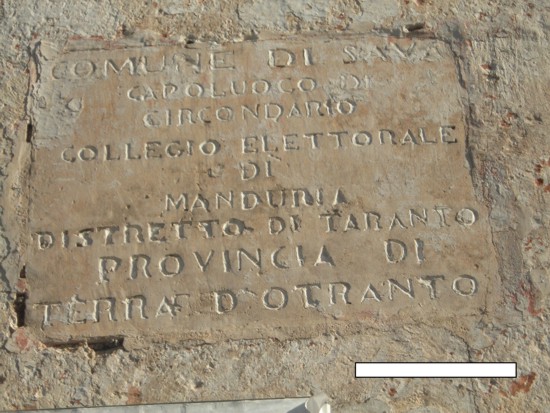 «Da fonti storiche si evince che nel Comune di Sava, erano state collocate tre “tabelle amministrative” poste dal governo centrale nei primi mesi del 1861, dopo la proclamazione del Regno d’Italia avvenuta il 17 marzo dello stesso anno» fa presente Carrieri. «Le tre tabelle furono poste lungo la direttrice Taranto – Lecce, all’entrata, nel centro ed all’uscita dell’abitato. Sulle tabelle, in pietra leccese (cm. 60x50 circa), è inciso il seguente testo: “Comune di Sava. Capoluogo di circondario. Collegio elettorale di Manduria, distretto di Taranto, provincia di Terra d’Otranto”».
