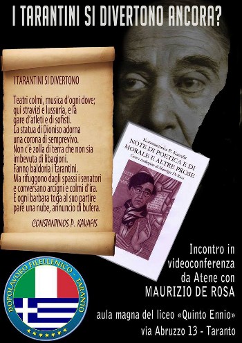 L’associazione culturale tarantina Dopolavoro Filellenico nei giorni scorsi ha voluto rendere omaggio al poeta della diaspora con una video conferenza in collegamento con Atene, da dove Maurizio De Rosa, profondo conoscitore dell'arte kavafiana, ha illustrato il suo volume “Note di poetica e di morale e altre prose”