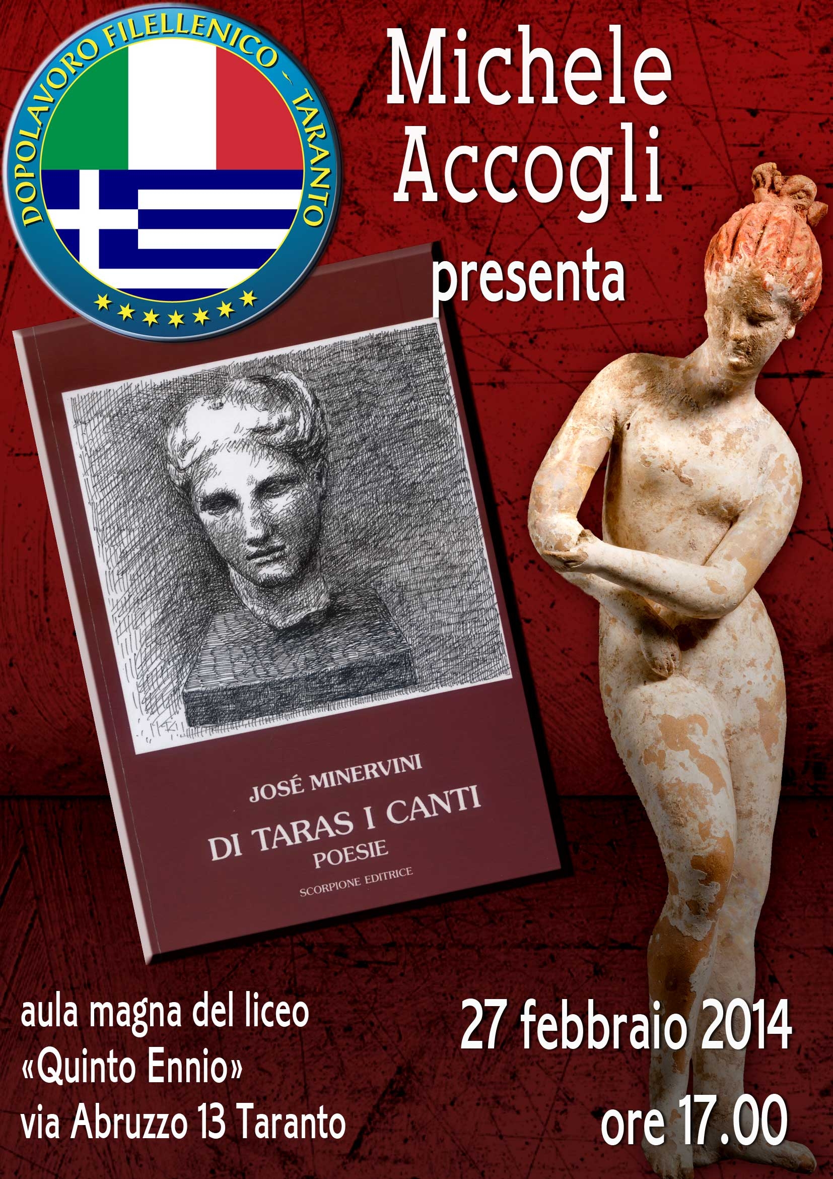 liceo Quinto Ennio, in via Abruzzo 13 a Taranto, lo studioso di archeologia Michele Accogli presenterà a soci ed ospiti dell’associazione culturale Dopolavoro Filellenico il libro di poesie di José Minervini «Di Taras i Canti» illustrando i reperti conservati al MarTa, il museo archeologico di Taranto, che hanno ispirato le liriche.