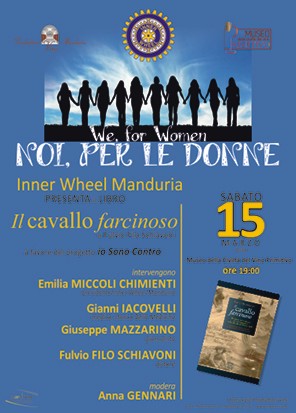 Primitivo, alle ore 19, su iniziativa del Consorzio Produttori Vini di Manduria e dell’Inner Wheel Club di Manduria, sarà presentato il libro “Il cavallo farcinoso” di Fulvio Filo Schiavoni, che ripercorre dettagliatamente un processo per la morte di un trappetaro nella Manduria di fine ‘800.La presentazione mira a sostenere il progetto “Io sono contro”, concorso a premi promosso e attuato da Aumedia, in collaborazione con l’associazione “Oltre l’Orizzonte”, condiviso dall’Inner Wheel Club di Manduria, che prevede la realizzazione di spot finalizzati a denunciare la violenza sulle donne e stimolare la cultura del rispetto.