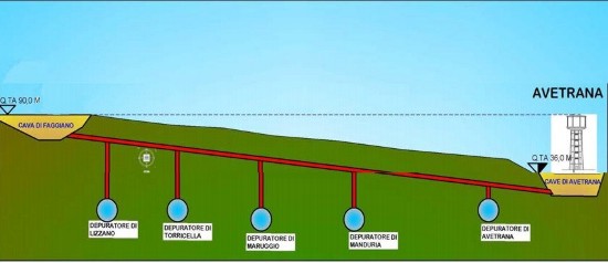 L’aspetto estremamente interessante di questo progetto è proprio la previsione del recupero delle acque reflue dei cinque depuratori di Lizzano, Torricella, Maruggio, Avetrana e Manduria, che eviterebbe appunto gli scarichi in mare