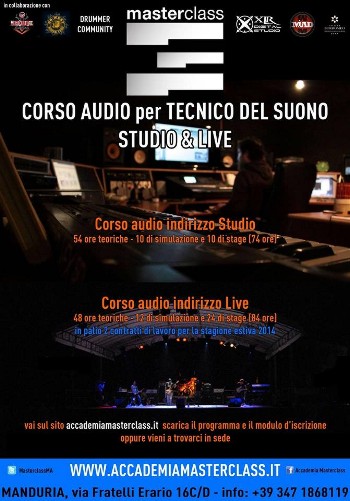 creandosi un proprio project studio, ma anche consigliato al musicista che desidera affrontare e conoscere l’aspetto audio delle proprie produzioni ed esibizioni live. La brillante idea è targata Marco Rollo, tecnico del suono con esperienza ultradecennale, nonché direttore dell’accademia “Masterclass”. Rollo, nell’arco della sua carriera da fonico, può vantare esperienze dal vivo e in studio con artisti di caratura internazionale quali: Eric Marienthal, Tom Kennedy, Horacio “El negro” Hernandez, Dennis Chambers, Steve Vai, John Stowell, Bill O’Connell, Dom Famularo, Andrea Braido, Fabrizio Bosso e tantissimi altri ancora. Marco Rollo dirigerà un programma didattico che prevederà un’area teorica di concetti fondamentali comune ai due indirizzi di 24 ore (con frequenza di 2 lezioni settimanali da 3 ore). Per l’indirizzo Live vi saranno ulteriori 24 ore teoriche (con frequenza di 2 lezioni settimanali da 3 ore), 12 ore di simulazione di un evento e 24 ore di stage. Per quanto concerne l’indirizzo Studio, invece, saranno previste ulteriori 30 ore teoriche (con frequenza di 2 lezioni settimanali da 3 ore), 10 ore di simulazione e 10 ore di stage. Alla conclusione del corso, i due allievi migliori riceveranno un contratto di lavoro per la stagione estiva 2014 presso l’azienda “Music & Culture” soc. coop. Dunque, un’iniziativa assai allettante e stimolante per tutti gli appassionati dell’audio engineering. Per ulteriori informazioni sul corso è possibile consultare il sito www.accademiamasterclass.it oppure telefonare al seguente recapito telefonico: 347/1868119