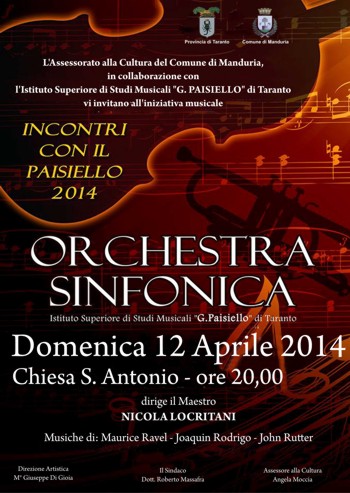 Il primo concerto, organizzato dal “G. Paisiello”, avrà luogo questa sera (sabato), alle 19.30, nella suggestiva cornice della Chiesa di Sant’Antonio. Si esibiranno l’orchestra e il coro dell’istituto musicale “Giovanni Paisiello” di Taranto, diretti dal maestro Nicola Locritani., il coro diocesano “Giovanni Paolo II” di Taranto e le soprano Valeria La Grotta e Mari De Biasi.Verranno eseguite musiche di Maurice Ravel,di Joaquin Rodrigo e il Requiem di John Rutter, compositore contemporaneo noto per le sue composizioni sacre