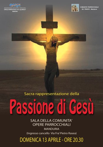 della Passione di Gesù”. Lo spettacolo sacro (sipario alle 20.30), è curato dal gruppo teatrale dell’oratorio “Don Luigi Neglia” e dal Circolo ANSPI della parrocchia della “SS. Trinità”. L’elaborazione drammaturgica e la regia sono curate da Rosalba Gennari. Oltre trenta gli interpreti. Il progetto teatrale nasce dalla forte volontà di recupero di una tradizione, in quanto la rappresentazione, parecchi anni fa, già si inscenava nella nostra città.