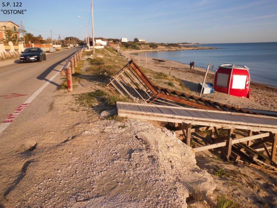 «“Canale d’Ostone”: da anni ormai un consistente tratto di spiaggia è occupato “abusivamente” da un vecchio box bar, un frigo e da passerelle in legno e ferro arrugginito che si inarcano pericolosamente sino ai margini della carreggiata; “Le Conche”: ai bordi della strada, e a circa 20 metri dalla battigia, un ampio “fosso” causato da una duna franata, oltre a rappresentare un pericolo per i mezzi in transito, si è trasformato in discarica di inerti di costruzione; - guard rail in lamiera arrugginita e tagliente erosi dalla salsedine staccati dai supporti di sostegno, mentre un tratto di spiaggia è stata cementata per realizzare uno scivolo per i pescatori da diporto; “Palmintello”: residui “monconi in legno” posti all’ingresso della spiaggia libera a “protezione dei bagnanti”; - “Torre Ovo- zona Barche”: cedimento di un tratto stradale; pali dell’illuminazione pubblica erosi dalla salsedine e a pericolo cedimento».
