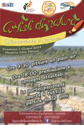 Le opere su supporti precedentemente timbrati all’inizio della giornata, verranno ritirate ed esposte all’interno della Masseria della Marina, dove si terrà in serata, la premiazione di due opere scelta dalla giuria competente e la consegna di un attestato a tutti i partecipanti. Inoltre per tutti i partecipanti ci sarà la possibilità di partecipare gratuitamente ad un evento espositivo, con un massimo di due opere a scelta, il 13 giugno 2014. L’estemporanea è aperta a tutti, per vivere insieme una giornata d'arte, di amicizia e di amore per la natura.