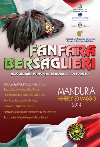 Bersaglieri di Toritto si esibirà venerdì a Manduria. L’iniziativa, che si inserisce nelle manifestazioni per la celebrazione della festa della Repubblica del 2 giugno prossimo, è stata organizzata dalla sezione di San Pancrazio Salentino (cui aderiscono alcuni bersaglieri di Manduria), in sinergia con il Comune di Manduria, la sezione di Manduria di Confcommercio e il Consorzio Produttori Vini di Manduria.L’appuntamento è per le ore 17.30. Partendo da corso XX Settembre, più precisamente dall’altezza della chiesa intitolata a Santa Maria, fanfara e bersaglieri daranno vita ad un corteo a “passo di corsa” in direzione di piazza Garibaldi, luogo in cui saranno accolti dal sindaco e dalle altre autorità. Saranno presenti anche altre associazioni di militari in congedo.