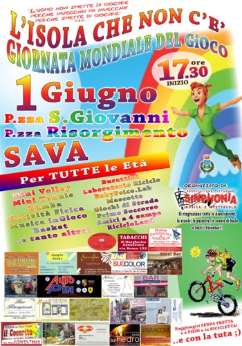 Queste le attività previste e, fra parentesi, l’associazione che le propone: SOS Island, dimostrazione primo soccorso su bambini e simulazioni tra di loro (SOS Sava); mini volley (Volley Sava); mini tennis (Tennis Club); zumba (Club 2001); Zumba Kids (Dance in the World); basket in carrozzina (A.Ge. Avetrana e MoViDabilia); atletica per tutti: staffetta genitori-figli, salto in lungo; laboratorio dei palloncini, trucca bimbi, animazione (Party Mania); Giochi di Strada (TIR, Scout Agesci Sava 2); Recyclisland, costruzione di giochi e strumenti musicali con materiali riciclati; ricicloLand & joga bimbi, villaggio di cartone tutto da colorare (Manu Infinity e M): baby-psicolab e gioco delle emozioni (Veronica Buccoliero); musica in gioco (Talenti Music Academy).