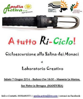 iniziativa che propongono l’associazione Apulia Activa e le Riserve Naturali Orientate del Litorale Tarantino Orientale nell’ambito del programma “Primavera in Riserva”. L’iniziativa, che si terrà questo pomeriggio, a partire dalle ore 16, chiama a raccolta gli amanti della bicicletta: si tratta di una cicloescursione con laboratorio creativo.Il raduno è fissato presso Casa del Parco – Masseria la Marina a San Pietro in Bevagna. Al rientro in masseria, dopo la ciclo escursione, grandi e piccini potranno dedicarsi ad un laboratorio di auto-produzione e riciclo dei i materiali provenienti dal mondo delle due ruote: camere ad aria, copertoni, ecc...
