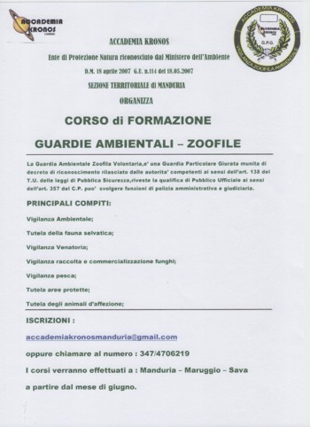 Kronos, ente riconosciuto dal Ministero dell’Ambiente e della Tutela del Territorio e del Mare, organizza un corso gratuito per espletare il servizio volontario come Guardia Ambientale Zoofila.Per accedere al corso bisogna essere maggiorenni e non avere carichi penali.