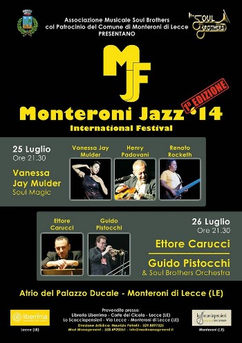 del comune di Monteroni di Lecce, presenterà la prima edizione del “Monteroni Jazz International Festival”.Venerdì 25 luglio, ore 21.30, si terrà il concerto di “Vanessa Jay Mulder – Soul Magic”. Vanessa Jay Mulder, raffinata cantante di origine surinamese, dotata di un accattivante timbro marcatamente soul, proporrà un repertorio di brani funk. L’artista sudamericana sarà accompagnata da due musicisti d’eccezione: Henry Padovani e Renato Rocketh. Padovani è un eccellente musicista francese, noto ai più come il primo chitarrista della storica rock band inglese “The Police”. Rocketh è un brillante bassista e compositore brasiliano. La viscerale musicalità e l’ottima tecnica strumentale rappresentano i segni particolari della sua carta d’identità.