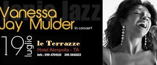 Le esclusive terrazze dell’hotel “Akropolis” saranno la location del concerto di Vanessa Jay Mulder, in programma il 19 luglio, alle ore 21.30. Dalla calda e intensa vocalità bluesy, la cantante romana d’adozione può sfoggiare un curriculum ricco di prestigiose collaborazioni con artisti di fama mondiale, quali: Luciano Pavarotti, Zucchero, Raf, Henry Padovani, Delmar Brown, solo per citarne alcuni. L’artista surinamese si esibirà al fianco di Vito Vignola, poliedrico pianista romano. Questo duo, voce e piano, proporrà un repertorio di brani blues, funk, soul, agghindato da alcune sfumature jazzy. Ergo, le terrazze dell’hotel “Akropolis” di Taranto offriranno una ghiotta opportunità di poter assistere a un concerto altamente raffinato, in compagnia dell’accattivante ed emozionante musica afroamericana.