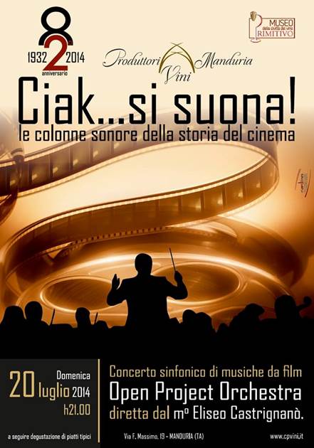 Nel piazzale interno della cantina è in programma lo spettacolo musicale ‘Ciak… si suona!’, concerto sinfonico di musiche da film eseguite da Open Project Orchestra, diretta dal maestro Eliseo Castrignanò.