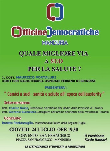Francesco, nell’ambito del dibattito culturale sul tema “QUALE MIGLIORE VIA A SUD PER LA SALUTE?” il dott. Maurizio Portaluri, direttore Radioterapia ospedale Perrino di Brindisi, presenterà il proprio libro dal titolo “Camici a sud-sanità e salute nell’epoca dell’austerity”.Interverranno: il dott. Cosimo Nume, presidente dell’Ordine dei Medici della Provincia di Taranto; il dott. Giovanni Buccoliero, consigliere dell’Ordine dei Medici della Provincia di Taranto; Donato Pentassuglia, assessore alla Salute della Regione Puglia.